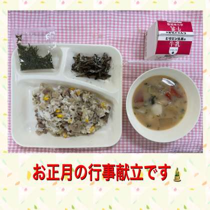 13日の給食は、正月の行事献立「れんこんのちらしずし、ぞう煮、ごまめ、牛乳」でした。ぞう煮は、白みその割合が多いみそ仕立てで、金時にんじんの赤がとてもきれいです。