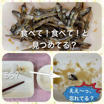 ごまめは、焼き物機でから焼きし、甘辛いたれをからめています。おいしいのですが、苦手な人も。聞くと「ごまめが見つめてくるから・・。」なるほど。私にはごまめの熱い視線は気になりませんが、確かにそのようにも見えるかな・・などと考えながら食べていて、ふと見るとポツンと1つだけ残ったごまめの頭が!確かに私を見つめて「もう!食べて!」と言っているみたいです。もちろんきれいにいただきました。