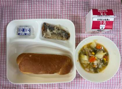 今日の給食は「おさつパン、あじのレモンマリネ、てぼ豆のスープ煮、固形チーズ、牛乳」でした。あじは1人一切れ、からっと揚げたあじに、程よい酸味のたまねぎがよく合っていました。でもこの酸味が苦手な人もいるかな、と思いながら教室を訪問していると、思ったよりあじは人気がありました。