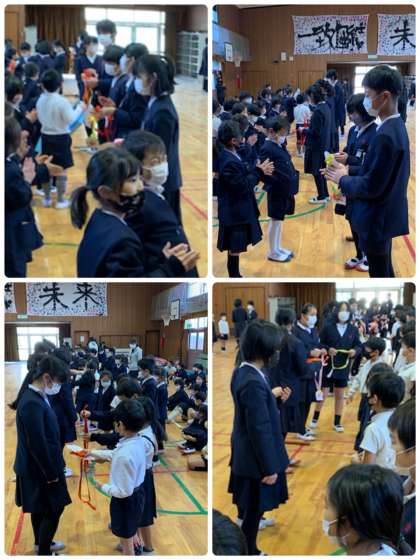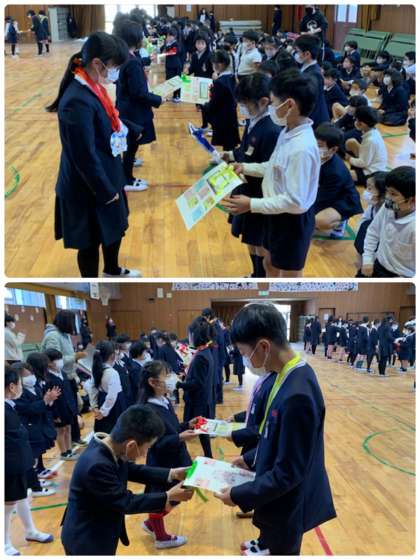 在校生から6年生へプレゼントを渡しました。1年生からは素敵なメダルを、2年生からは、縦割り班で一緒に活動した児童からのメッセージを渡しました。