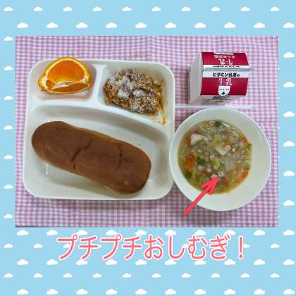 今日の給食は「黒糖パン、とうふのミートグラタン、押麦と野菜のスープ煮、デコポン、牛乳」でした。グラタンは大好評。スープ煮は、プチプチの押麦の食感を楽しみながら食べました。デコポンは、各クラスちょっとずつおまけが入っていて、みんな大喜び!今日はとっても甘くて、皮もうすくて食べやすかったです。「何個でも食べれそう!」と大好評でした。