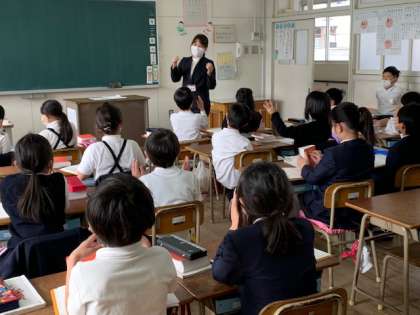 授業前の休み時間、手拍子に合わせて、「気持ちを表す言葉」を順番に言っていきました。最後の児童の言葉「楽しい」から、「楽しい授業にしよう」という先生の言葉で授業が始まりました。