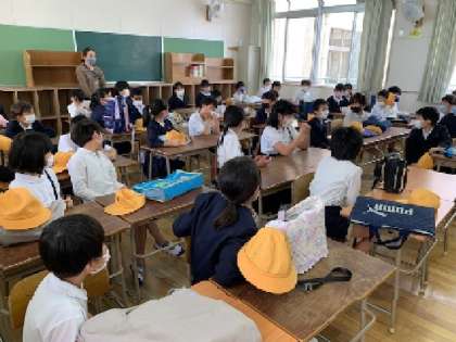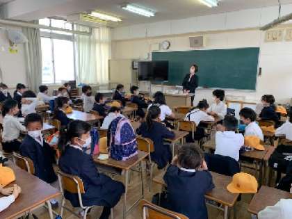 4年生の教室の様子です。4年生は、新しく3階の教室になります。座席が決まって、荷物を持って席に着いたところです。この後、新しい担任の先生に向けて自己紹介をしました。名前と好きなものなどを、一人ひとり紹介しました。一人の紹介が終わるたびに、みんなで拍手を送っています。とてもなごやかな雰囲気で、新しい学年がスタートしました。