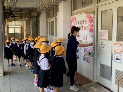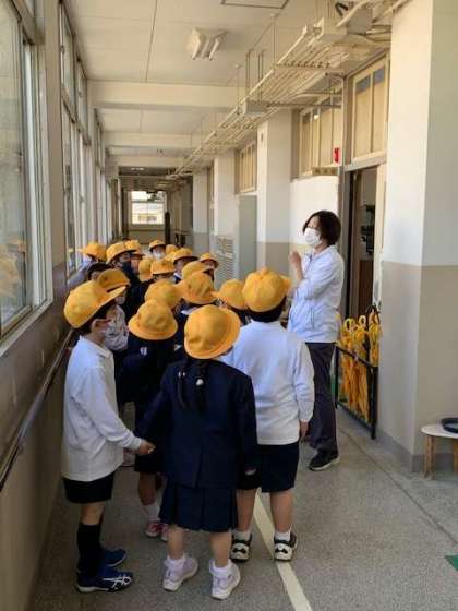 保健室も教えてもらいました。保健室に入るときの作法についても教えてもらいました。2階にあがって、職員室も覚えました。