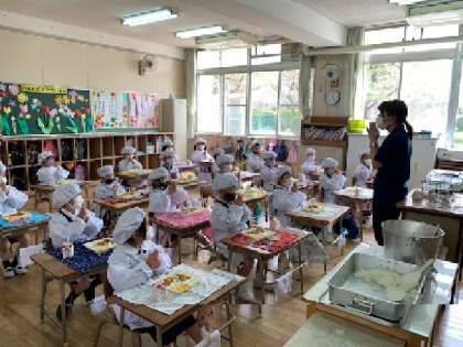1年生にとって、小学校での初めての給食です。準備の時から、給食を楽しみにしている様子、待ち遠しい様子が伺えました。献立も事前に、お家で見てきたようで、「カレーライス、楽しみ!」と言っていました。みんなで「いただきます」をしました。