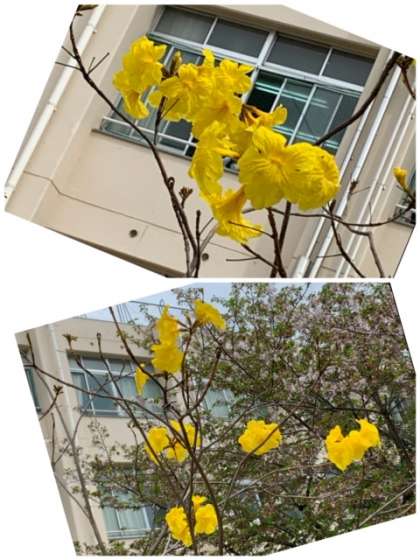 このところの温かい気温の影響でしょうか、九条北小学校の中庭の花々が一挙に咲き始めています。百周年に記念植樹した「イペー」の花もきれいに咲きました。「イペー」の花言葉は、「栄光」と「元気」です。この花言葉のように、みんなで元気に過ごしましょう!