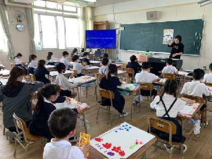 先生の絵も黒板にはって、一緒に描いています。「どんなおうちにしようかな?」「何色がいいかな?」という先生の声に、児童たちも楽しそうに反応していました。「白色でおうちを描いたらどうなるかな?」すかさず、先生が「いね!おうちを白色にするなら、どんな工夫をしたらいいかな?」など、楽しいやり取りをしながら進んでいっていました。図工に取り組む児童たちの様子が、とても楽しそうでした。