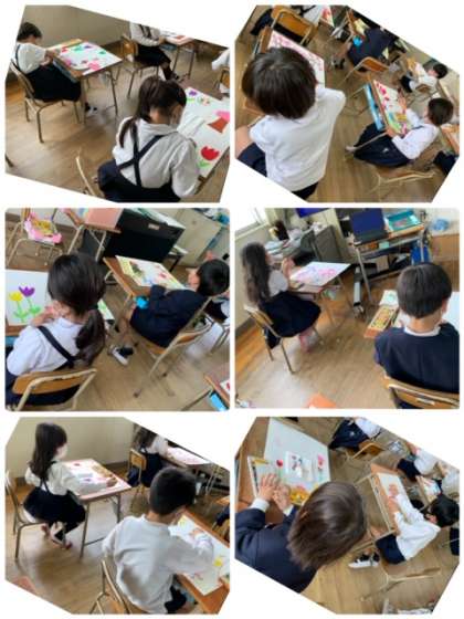 2年1組の図工の時間の様子です。「お花見スケッチ」に取り組んでいます。今日のめあては、「お花の中に、じぶんのおうちをたてよう」です。これまでの時間に、カラフルな色どりあふれる木や花を描いています。今日は、その中にじぶんのおうちを書き入れます。