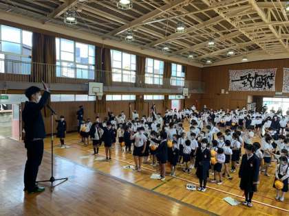 4月22日(金)、「たてわり班集会」のために、全校児童が講堂に集まってきました。6年生の班長は、1年生を教室までお迎えに行き連れてきてくれました。