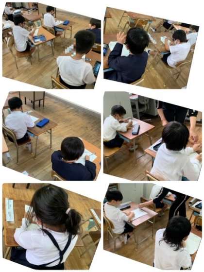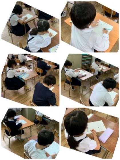 1年2組の生活の時間の様子です。朝顔の種の観察をしました。今日の学習のめあては、「たねの かんさつをしよう」です。朝顔の種を観察して、ワークシートに絵を描いていきました。形や色、模様などをよく見て描いています。これから、朝顔の種をまいて、成長の記録もつけていく予定です。