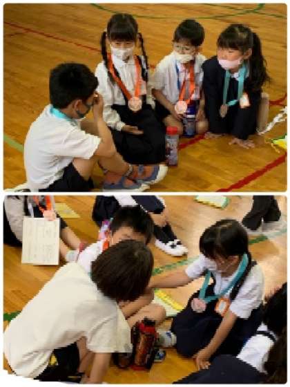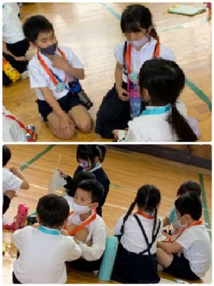 班で自己紹介をしています。2年生は、組と名前だけではなく、「自分の好きな教室」も紹介していました。