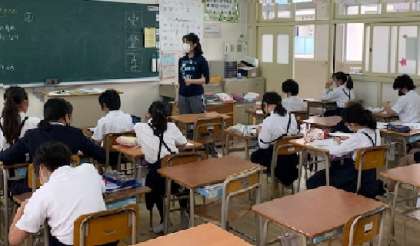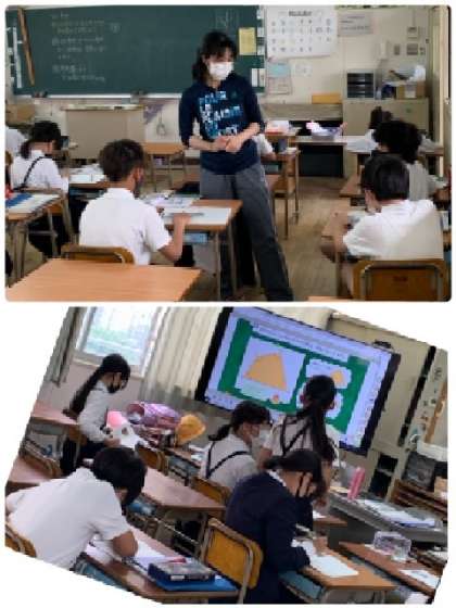 5年1組の算数の時間です。1学級が2つの教室に分かれて、少人数で学習を進めています。今日のめあては、「四角形の角の大きさの和の求め方を考えよう」です。問題「四角形の4つの角の大きさの和は、何度になりますか。」をどのように考えていったらよいのか知恵を出し合っています。