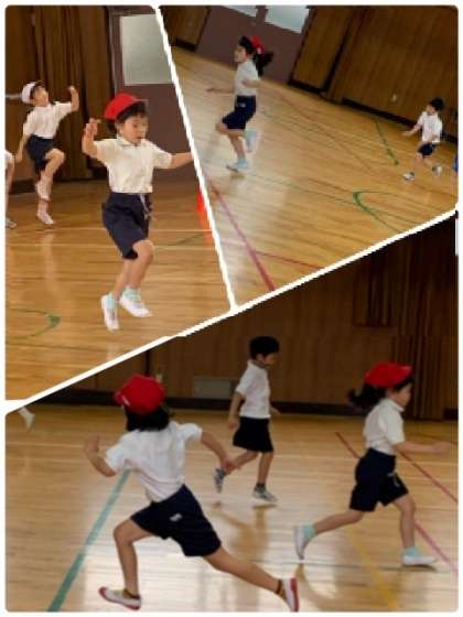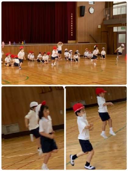 1年1組の体育の時間です。今日は天候が悪いので、講堂で行いました。4つの班に分かれて活動しました。先生の指示の通りに動いて、コーンを回ってきます。元の場所に戻ってきたら、次のお友だちにタッチします。