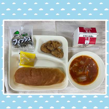 今日の給食〜こっちはカツです〜 公開日 2022/05/18 更新日 2022/05/18 給 食 今日の給食は「コッペパン、一口トンカツ、ミネストローネ、ミニフィッシュ、アプリコットジャム、牛乳」でした。修学旅行中の6年生はカレーライス!そして1〜5年生は一口トンカツ!こちらもおいしくいただきました! いいね(0)