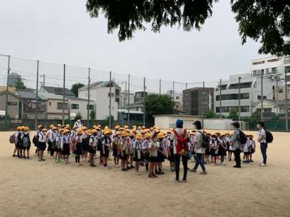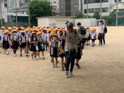 1・2年生も春の遠足で天王寺動物園に行きます。運動場に集合してきました。先生から「昨日はしっかり寝ましたか?」の問いかけに、大きくうなづいていました。「元気な人?」という質問には、一斉に手が上がりました。1年生にとってもですが、2年生にとっても、初めての遠足になります。みんな、とてもうれしそうな表情です。笑顔で、元気よく、「行ってきます!!」の声で出発しました。