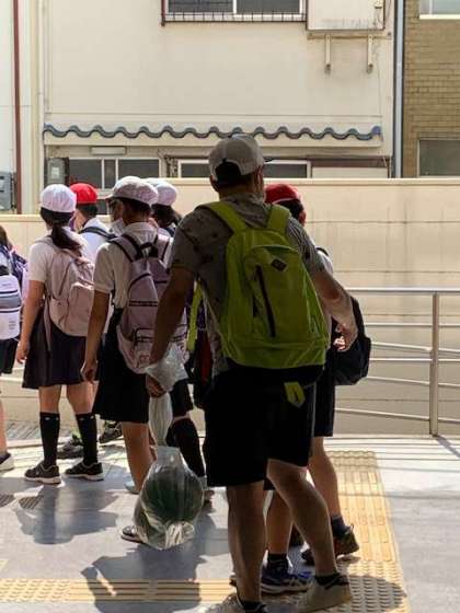 5月23日(月)、今日は3・4年生の遠足です。天候の影響で、一度延期となったこともあり、児童たちはとても楽しみにしている様子です。今日は、晴天に恵まれ、元気に、花園中央公園へ向けて出発しました。