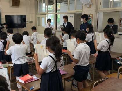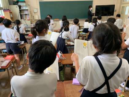 第1回「研究の日」〜3年1組で研究授業を実施しました! 公開日 2022/05/23 更新日 2022/05/23 お知らせ 今日の学習の本題に入りました。教科書の「すいせんのラッパ」を音読しています。最初は全員で、続いて、一人ずつ・・・先生の合図で、次の人が音読の続きをします。 いいね(0)