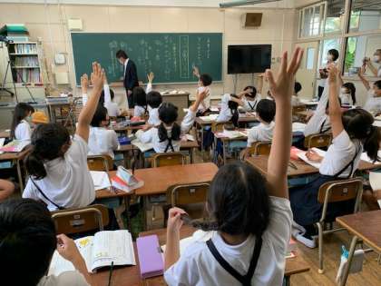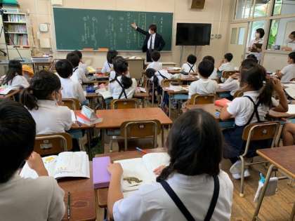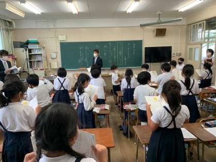 休み時間を挟んで、お越しいただいた講師先生による授業が始まりました。児童たちは、休み時間の間に、積極的に話しかけていて、すっかりなじんでいます。