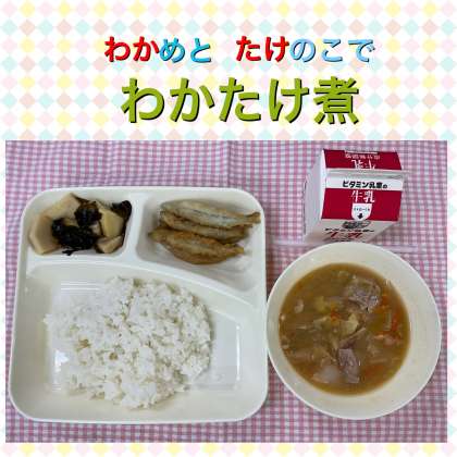 今日の給食は「ごはん、きびなごてんぷら、豚汁、わかたけ煮、牛乳」でした。きびなごてんぷらは、揚げたてんぷらにしょうゆだれをかけて、ごはんに合うようにしています。そしてわかたけ煮はわかめとたけのこの煮もので、わかめの「わか」とたけのこの「たけ」を名前に使っています。「わかたけ煮ってなに?」「わかめとたけのこの煮もので、わかめのわかとたけのこのたけでわかたけ煮だよ」と話すと「そうなんやぁ!」ちょっと苦手にする人もいましたが、春の味を給食でお届けしました。