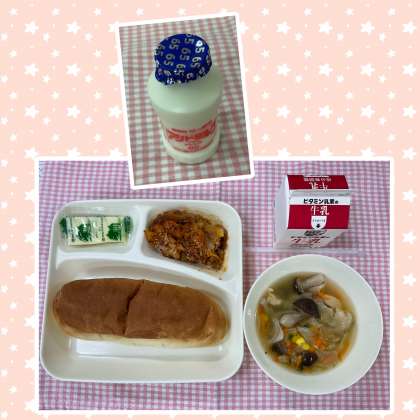 今日の給食は「コッペパン、じゃがいものミートグラタン、スープ、発酵乳、ソフトマーガリン、牛乳」でした。ミートグラタンは、ひき肉とじゃがいもを使ったケチャップ味で、子どもに大人気。そして、今日ちょっとびっくりしたのが、私のスープ煮入っているしめじの存在感がすごい!大きい!!最後のお楽しみにして、おいしくつるんといただきました。