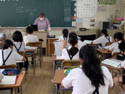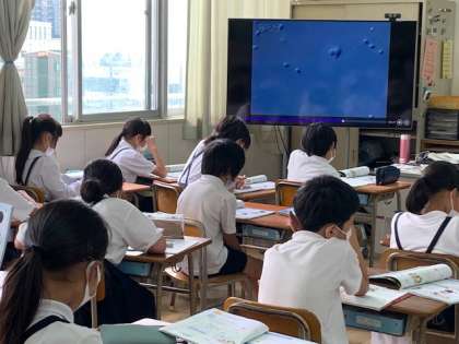 5年1組の理科の時間です。問題「メダカのたまごは、どのように育っていくのだろうか」の学習をしています。メダカの卵の様子を大型モニターで見ながら学習しました。また、「そう眼実態けんび鏡の使い方」についても教えてもらいました。