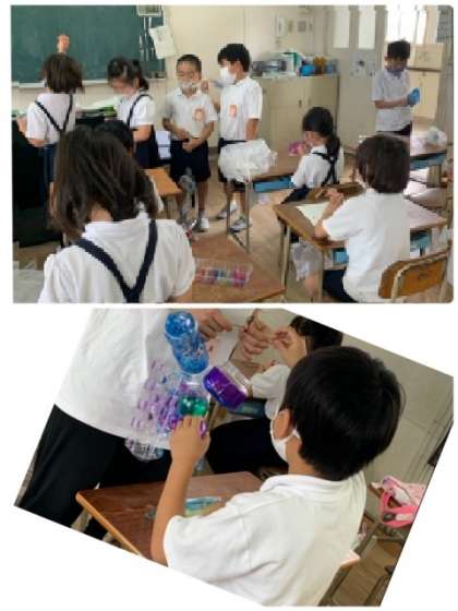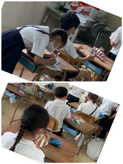 2年1組の図工の時間です。図工の学習「光のプレゼント」のための制作をしています。お家で用意していただいた様々なパック類に好きな色を付けていきました。制作中もとても楽しそうに取り組んでいます。出来上がった時には、さらに満足そうな表情をしていました。