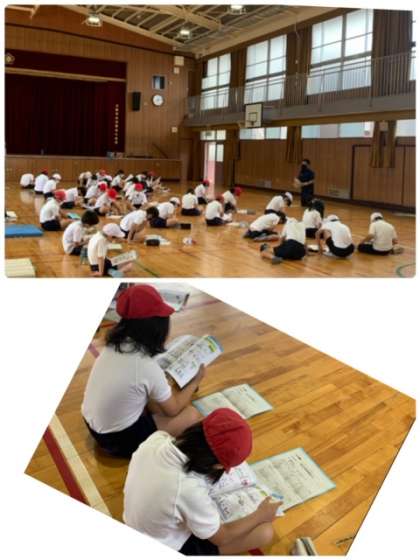 6年生の体育の時間です。1・2組合同で、「マット運動」に取り組んでいます。最初に、ワークシートと教科書を使って、「どんな種類があるのか」「6年生でめざすところは」などについて説明を聞いていました。