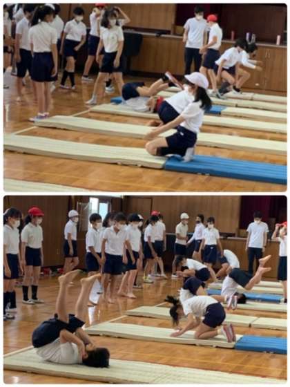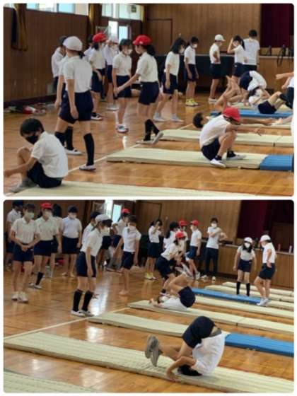 いよいよ練習開始です。初日なので、これまでの学年で練習してきた「前転」「後転」「開脚前転」「開脚後転」にチャレンジしました。ペアを組んで、互いにアドバイスしながら取り組んでいます。