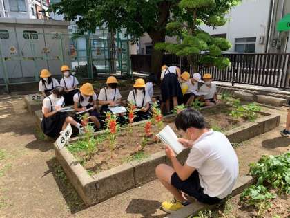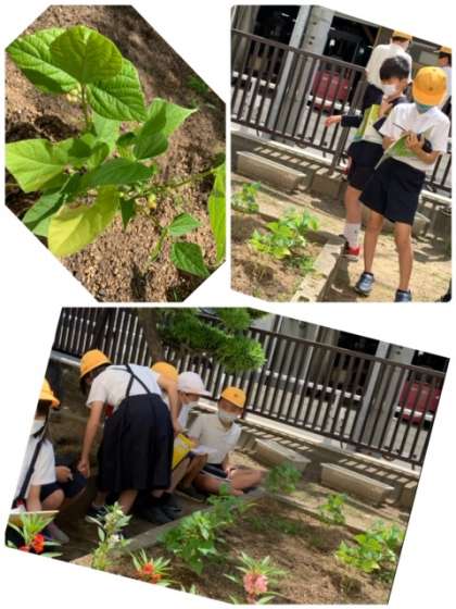 6年1組の理科の時間です。学習園で育てている「ホウセンカ」と「インゲン豆」の成長の様子を記録しています。「ホウセンカ」はきれいな花が咲いていて、今が一番きれいな時期のようです。