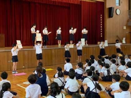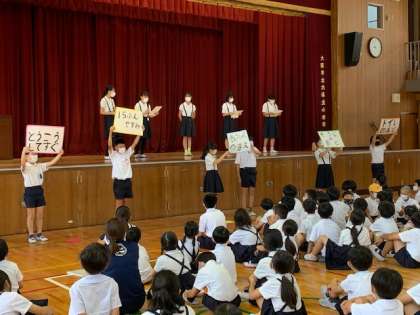児童集会の終わりに、環境・健康委員会より「保健強調週間」のお知らせがありました。来週6月6日(月)〜10日(金)が、「保健強調週間」です。昨年度は、特に、「手洗い」について取り組みましたが、今年度は、それに加えて、「規則正しい生活習慣を身に付ける」ことに取り組みます。「けんこうCheckカード」で、寝る時刻、起きる時刻を自分で設定し、目標を立てて取り組んでいきます。保護者の皆様のご協力も、よろしくお願いいたします。