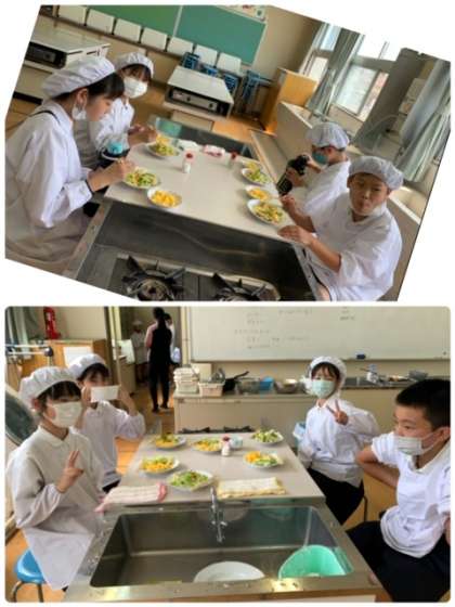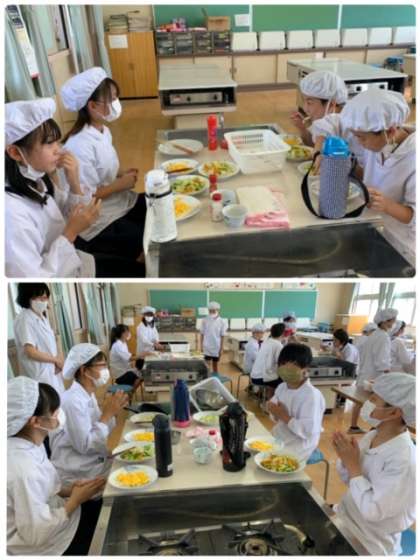 今回の調理実習の献立は、「三色野菜いため」と「スクランブルエッグ」です。おいしく出来上がりました。