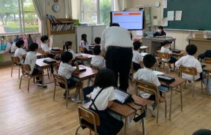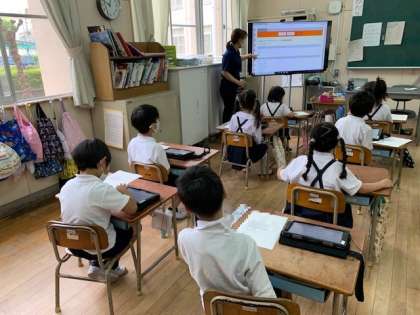 1年生は、1・2組とにも、1時間ずつ使って、学習用端末の操作を教えてもらいました。指導には、担任の先生に加えて、ICT担当の先生と本校に派遣されているICTアシスタントの方にもたずさわっていただきました。