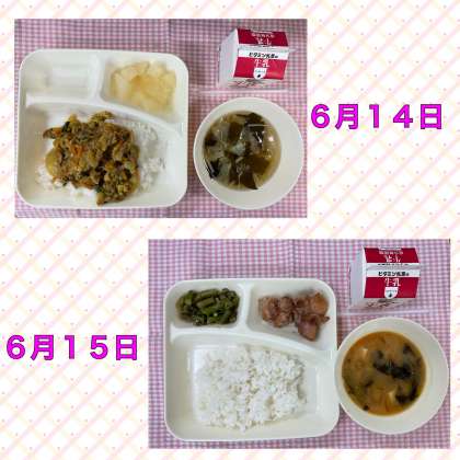 14日の給食は「和風カレー丼、すまし汁、和なし(カット缶)、牛乳」でした。だしベースの和風カレーは、本当においしい!普段のカレーライスももちろんおいしいのですが、だしのうま味がおいしさをさらにアップしてくれているように思います。「むっちゃおいしかったよ!」と大好評でした。