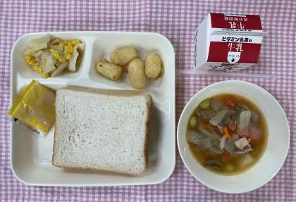 今日の給食は「食パン、いかてんぷら、フレッシュトマトのスープ煮、サワーソテー、アプリコットジャム、牛乳」でした。いかてんぷらはさくさくに揚がっていて好評。そして今日は、久しぶりの食パンでした。1年生に見に行くと、思ったよりパンのみみを残して食べる様子が。他には、みみも食べるけど、まずは食パンの真ん中をちぎり取り、丸める子も!