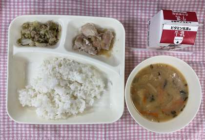 今日の給食は「ごはん、鶏肉のおろしじょうゆかけ、みそ汁、野菜いため、牛乳」でした。おろしじょうゆはいつも人気です。肉にかけても魚にかけてもおいしく食べることができます。