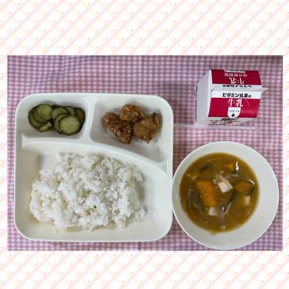 今日の給食は「ごはん、豚肉のたつたあげ、みそ汁、きゅうりの甘酢づけ、牛乳」でした。たつたあげは、豚の角切り肉を使っているので、ころころした仕上がりです。ボリュームがありおいしいのですが、前歯が生え変わりでグラグラしている子たちにはなかなか食べるのが大変だったようです。「奥歯でかもうと思うんだけど、けっこう大変やぁ〜」「おいしいねんけど、かみにくい〜」ちょっと大変な給食時間でした。