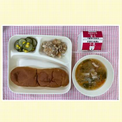 今日の給食は「黒糖パン、鶏肉のからあげ、中華みそスープ、きゅうりとコーンの甘酢あえ、牛乳」でした。午後から懇談会があるので、少しあわただしい給食時間です。しかし何といっても大人気メニュー!からあげのおかわりがほしい人はたくさんです。小さなかけら(天かすのようなもの)は、もう油ばかりなので食べずにやめておこうと言って、食缶の端によけていたら、「こっちがほしい!」という子がたくさんいました。そちらもおいしいかもしれないけれど、やっぱり肉の方を食べてほしいので、おかわりはそちらを。あっという間に食缶はからっぽになりました