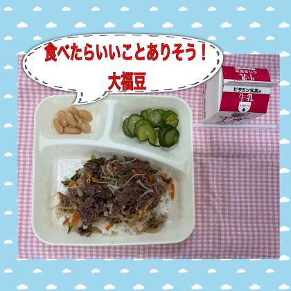 今日の給食〜いいことあるかな〜 公開日 2022/07/13 更新日 2022/07/13 給 食 今日の給食は「牛丼、きゅうりのしょうがづけ、大福豆の煮もの、牛乳」でした。牛丼はしっかり味がついていて、ごはんがすすみました。大福豆(おおふくまめ)は、白いやや大きめの豆で、いんげん豆の一種です。大福豆ってなんだかとても縁起いい名前のように感じます。「食べるといいことあるかな?」なんて言いながら食べている子もいました。 いいね(0)