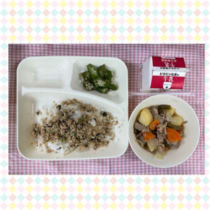 今日の給食は「ごはん、豚肉とじゃがいもの煮もの、オクラの梅風味、ツナっ葉いため、牛乳」でした。今日は、1年生の教室に行くのがいつもより遅くなってしまいました。ずいぶん食べすすんでいたのですが、「みてみて、こんなに食べてるよ」「オクラ食べたよ」「あとこれだけ!」「さんどまめ、苦手やけど食べるから見てて!」などいろいろ教えてくれます。4月から始まった給食、ずいぶんしっかり食べることができるようになりました。1学期の給食もあと1日です!