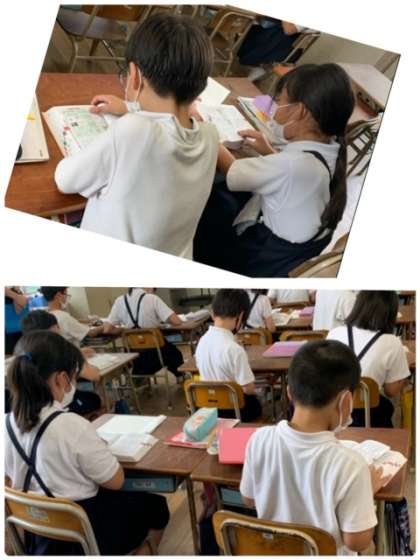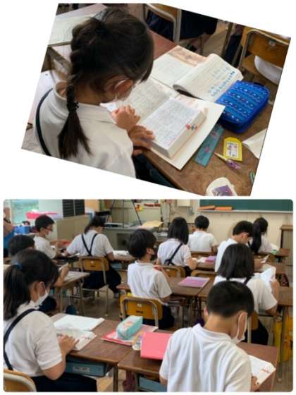 研究授業は、3年1組で行いました。授業前から児童たちは、講師先生との出会いへのワクワク感やたくさんの先生方に見られる緊張感を織り交ぜた様子・・・。辞書引きで、授業への気持ちづくりをしています。先生の出す「ことば」を国語辞典で素早く引いて・・・。
