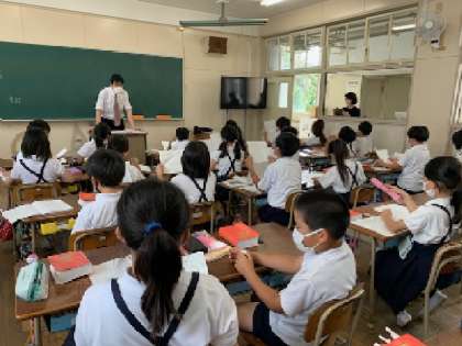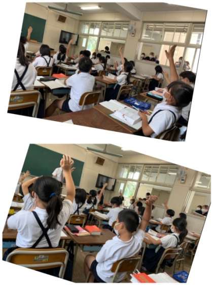 今回の授業は、説明文「めだか 杉浦 宏」を使って進めていただきました。最初に、先生との出会いの場面として、「先生についてのクイズ」が出題され、みんなノリノリです。