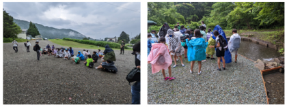 まず、避難訓練を兼ねて宿舎前広場に集合。その後魚つかみの場所へ移動しました。
