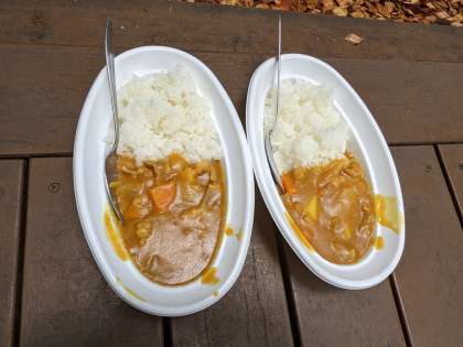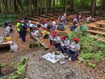 昼食のカレーライスもおいしくできあがり、みんなでなかよくいただきますをして、食べ始めました。