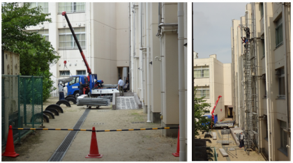 今年の一番大きな工事は、図書室のエアコン更新工事。屋上に大きな室外機があるため、クレーン車を使って上げ下ろしをします。道路を占拠してご迷惑をおかけいたしますが、ご了承ください。