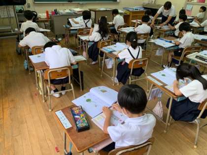 1年1組の国語の時間の様子です。漢字の「山」について学習しています。山を使った単語には、どんなものがあるか考えました。次に、それを使った文章も考えてみました。考えた文を、発表してくれています。そうして、漢字の練習帳で、「山」の漢字を練習しています。