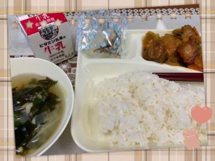 9月2日(金)、今日の給食は「ごはん、酢豚、中華スープ、アーモンドフィッシュ、牛乳」です。