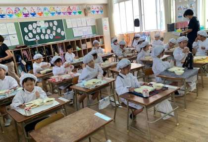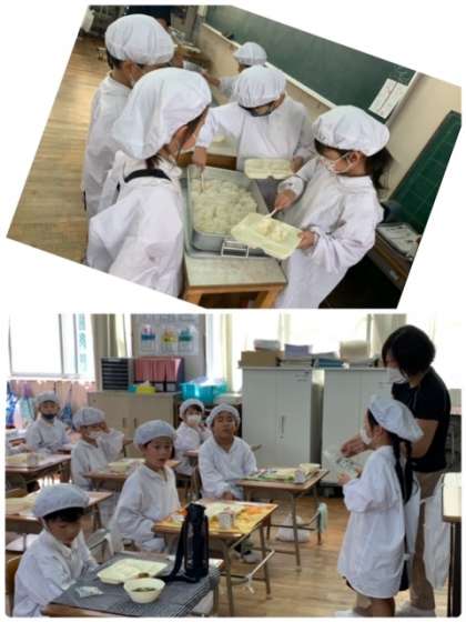 1年2組の給食の時間です。1学期のはじめは、6年生にお世話になっていた「給食の準備」ですが、1年生も自分たちで上手にできるようになりました。配膳が終わって、給食係と先生から「今日の献立」が紹介されました。そして、みんなで「いただきます!」をしました。