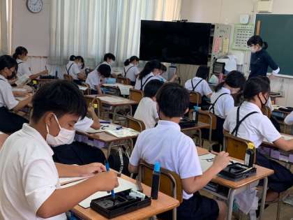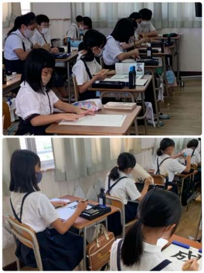 5年1組の書写の時間です。「成」の字の練習をしています。書き順を確かめながら、集中して取り組んでいます。