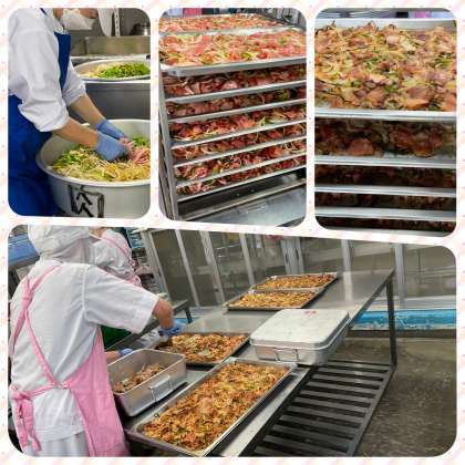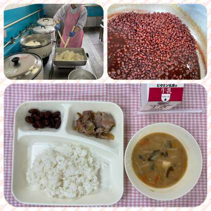 今日の給食は「ごはん、豚肉の甘辛焼き、みそ汁、金時豆の煮もの、牛乳」でした。金時豆は釜でしっかり下ゆでしてから味を含ませています。焼き物機で調理することもありますが、釜でゆっくり煮たので柔らかく仕上がっていました。