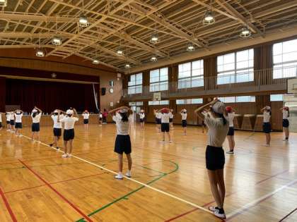 6年生の体育の時間です。授業のはじめに、「シナプソロジー」に取り組んでいます。